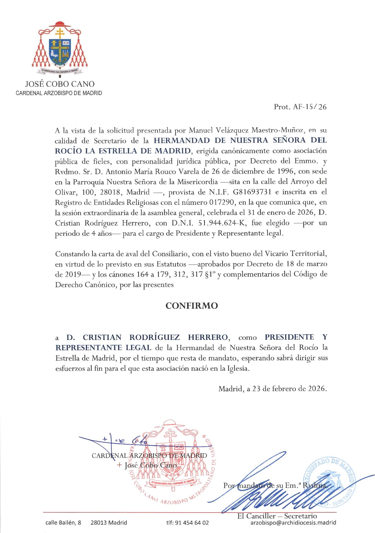Se ha recibido el 23 de febrero de 2026, de parte del Cardenal Arzobispo de Madrid, Emmo. y Rvdmo. Sr. D. José Cobo Cano, la confirmación de la idoneidad como Presidente de la Hermandad de Nuestra Señora del Rocío la Estrella de Madrid a D. Cristian Rodríguez Herrero.